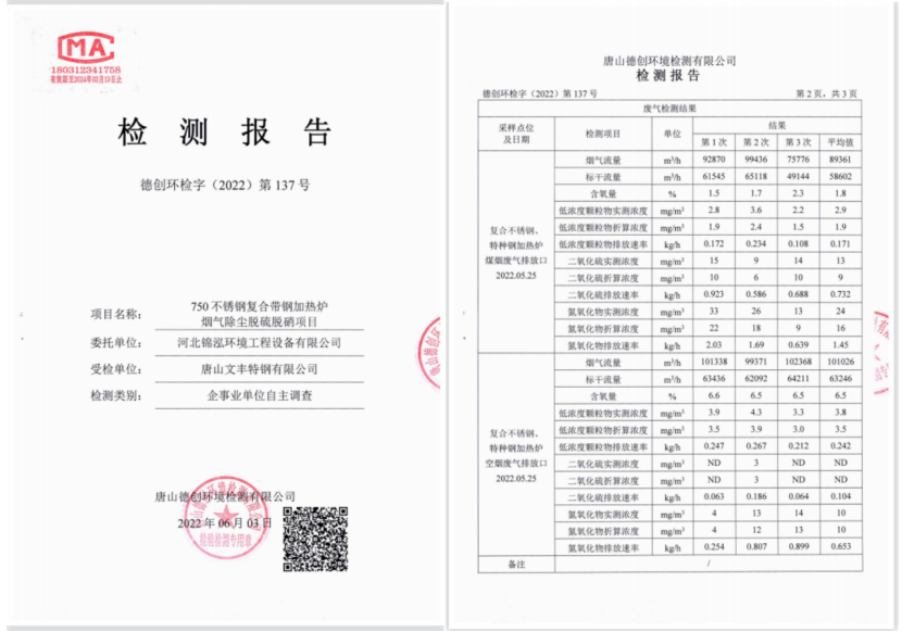 唐山文豐特鋼有限公司750不銹鋼復(fù)合帶鋼加熱爐煙氣除塵脫硫脫硝項目是河北錦泓環(huán)境工程設(shè)備有限公司于2021年10月份投建完成,項目從開工到建設(shè)完成歷時僅2個月。本項目采用的加熱爐煙氣治理工藝為SDS干法脫硫+布袋除塵+SCR脫硝,實現(xiàn)設(shè)計的排放濃度,SOx濃度<20mg/Nm3。出口NOx濃度<50mg/Nm3,預(yù)留<30mg/Nm3。煙氣粉塵顆粒物指標(biāo)<5mg/Nm3。