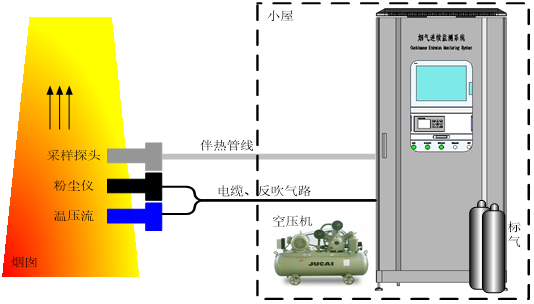 本系統(tǒng)由置于煙囪上的采樣探頭、粉塵儀和溫壓流一體化探頭,以及置于小屋中的分析機(jī)柜、標(biāo)氣和壓縮氣源組成。
